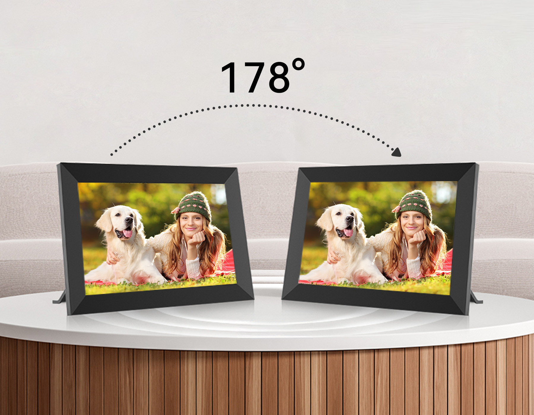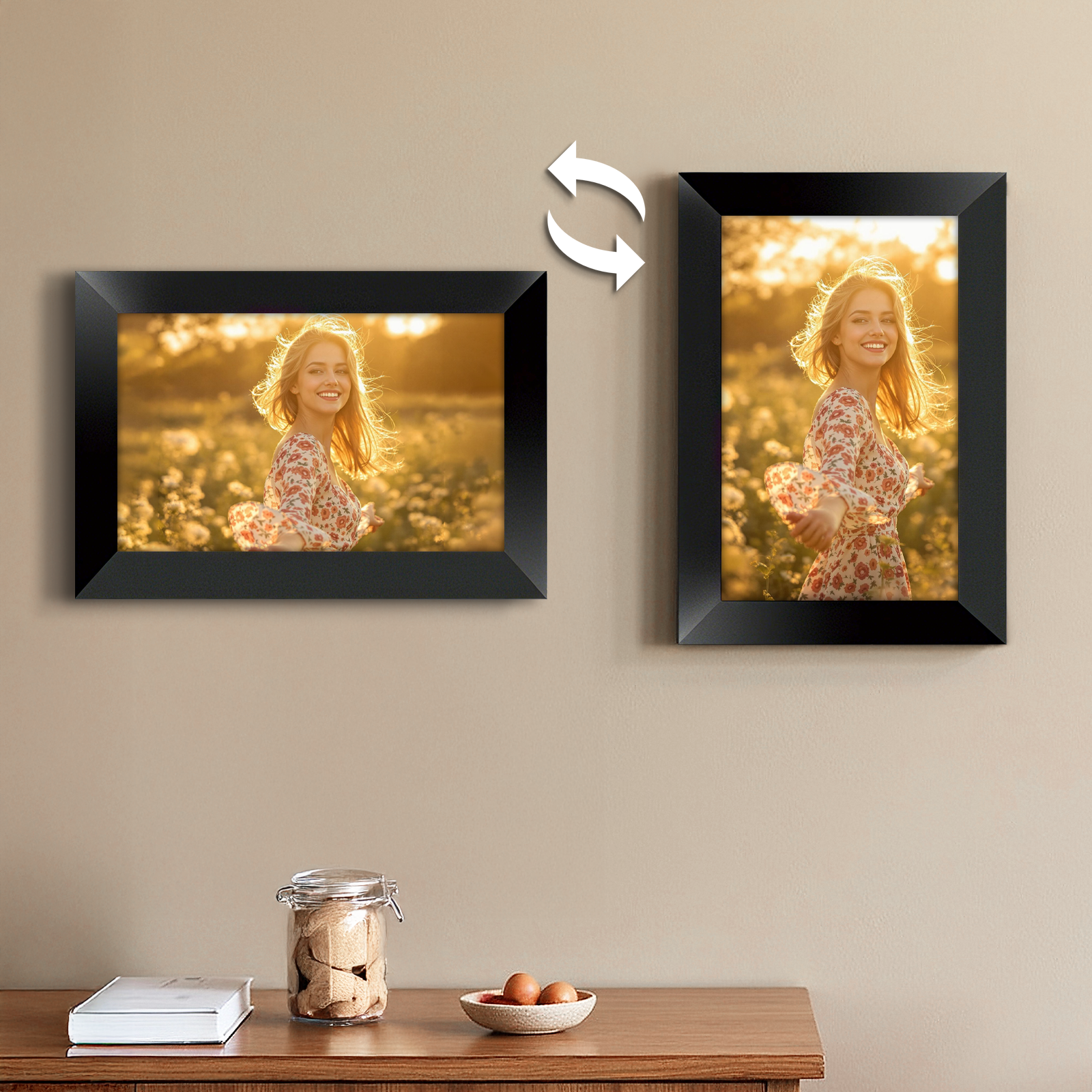 Dank des eingebauten Schwerkraftsensors stellt sich die Anzeige automatisch auf die Ausrichtung ein, egal ob Sie den Rahmen horizontal auf einem Tisch platzieren oder vertikal an der Wand aufhängen. Er zeigt jedes Foto im perfekten Winkel an, ohne manuelle Anpassungen – für eine schnelle und einfache Nutzung.