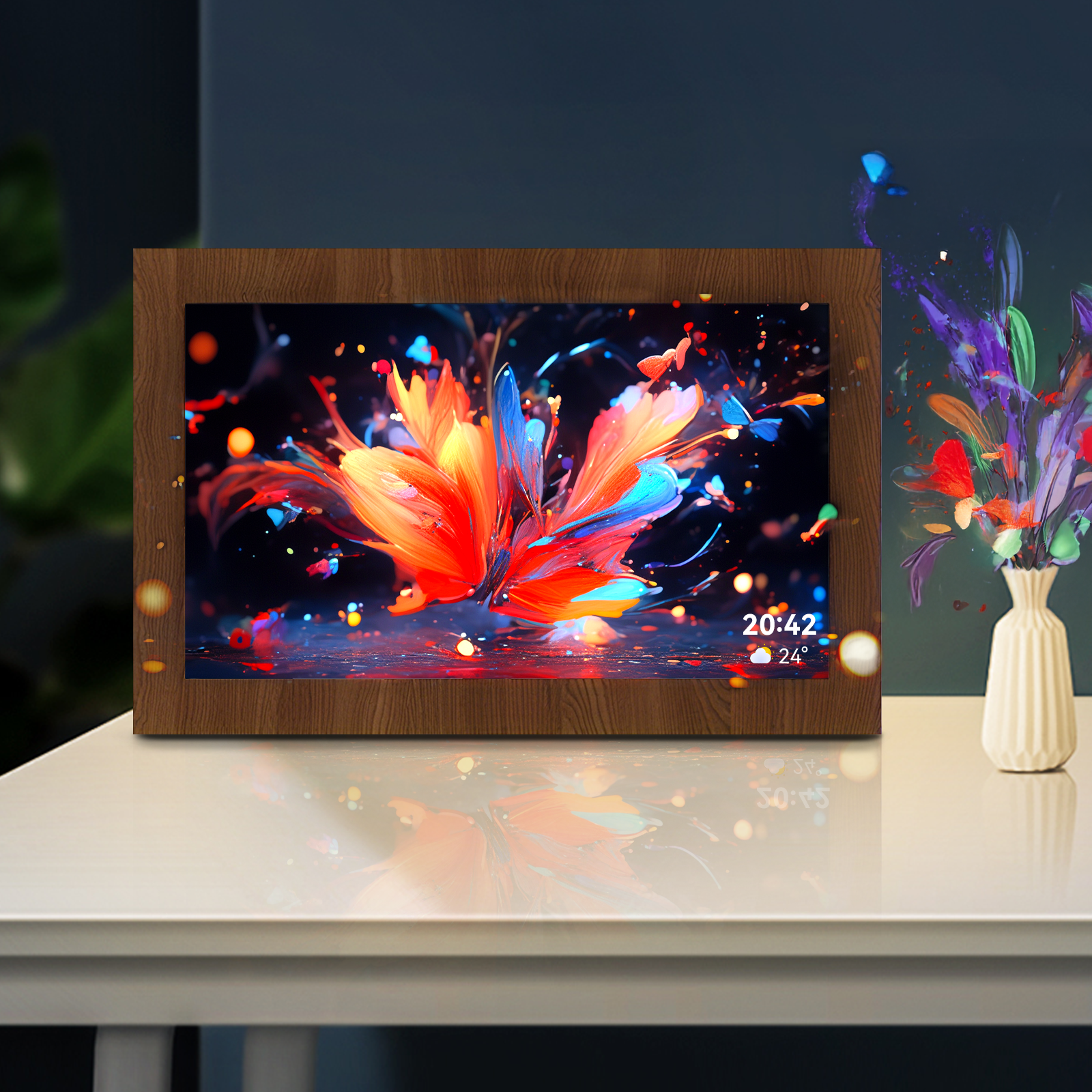 Der Valis Smart Photo Frame ist ein intelligentes Zentrum für Ihr Zuhause. Er kombiniert eine Uhr, einen Kalender und eine Echtzeit-Wetteranzeige mit einer lebendigen Fotoshow. Mit einem einfachen Tipp können Sie Fotos „liken“, um Ihre Liebe zu teilen und jeden Moment in eine interaktive, herzliche Erinnerung zu verwandeln.