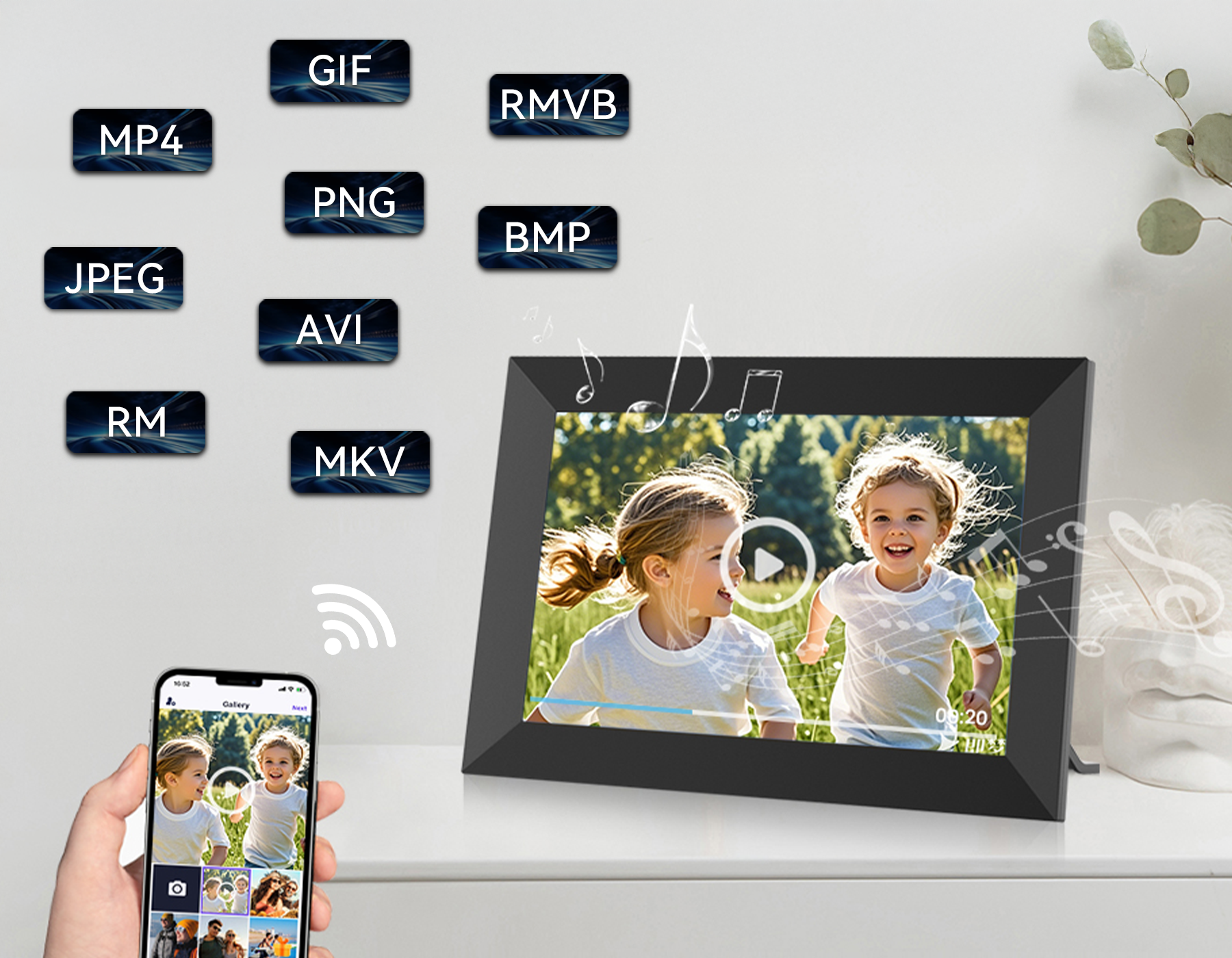 Verleihen Sie Ihren Diashows mehr Dynamik. Der Valis Smart Photo Frame unterstützt HD-Videowiedergabe und wechselt automatisch und nahtlos zwischen Fotos und Videos. Es ist die perfekte Mischung aus der statischen Schönheit eines Fotos und der dynamischen Energie eines Videos, was Ihnen ein vollständiges audiovisuelles Fest bietet.